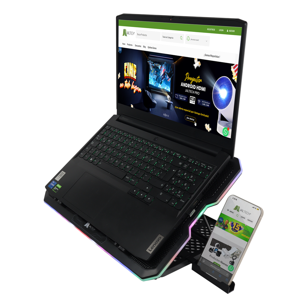 Soporta portátiles de hasta 17” y cuenta con stand para celular integrado.