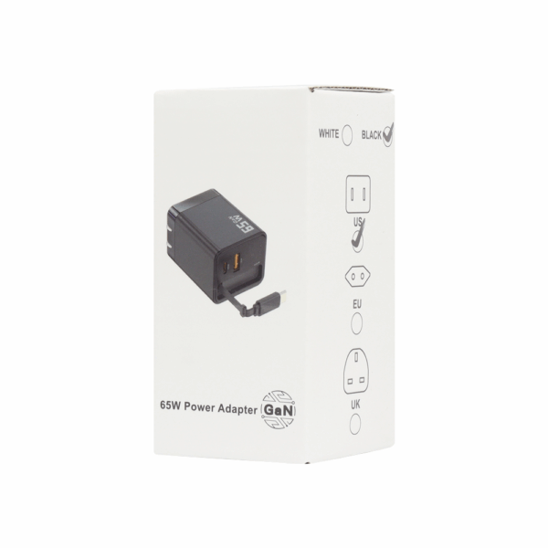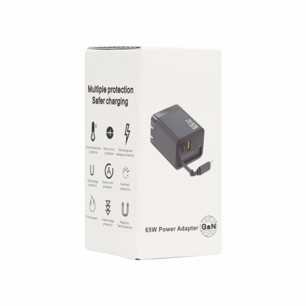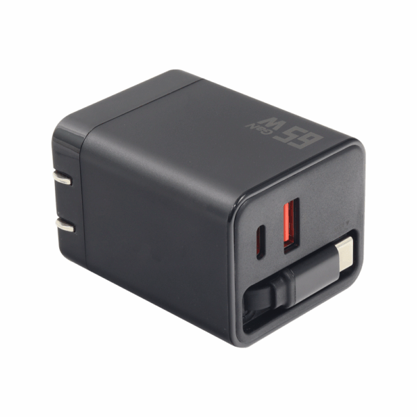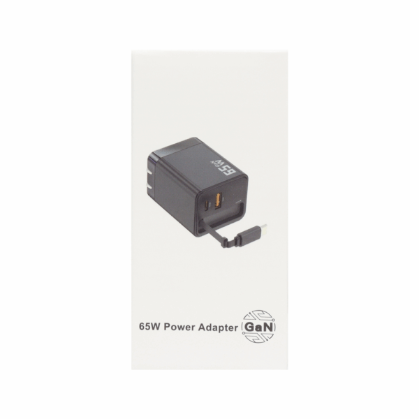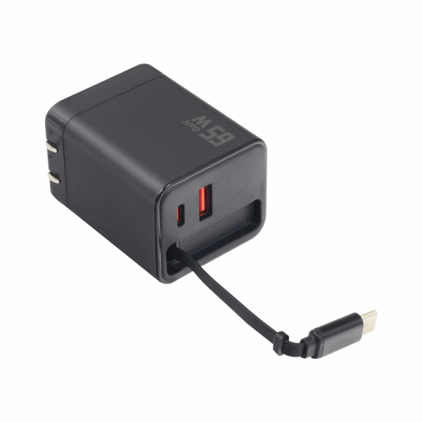 Adaptador retráctil con tecnología GaN de 65W, ideal para carga rápida y eficiente.