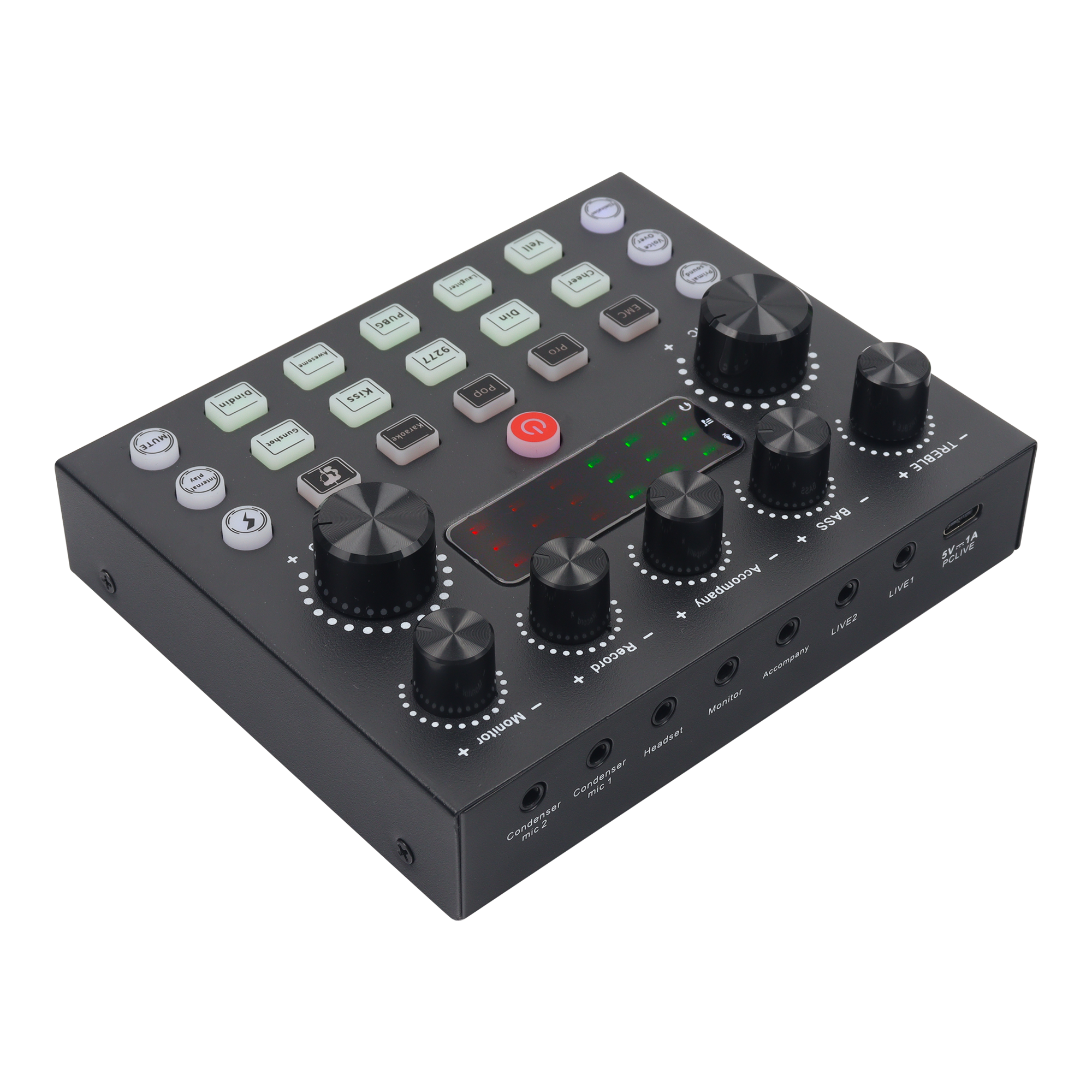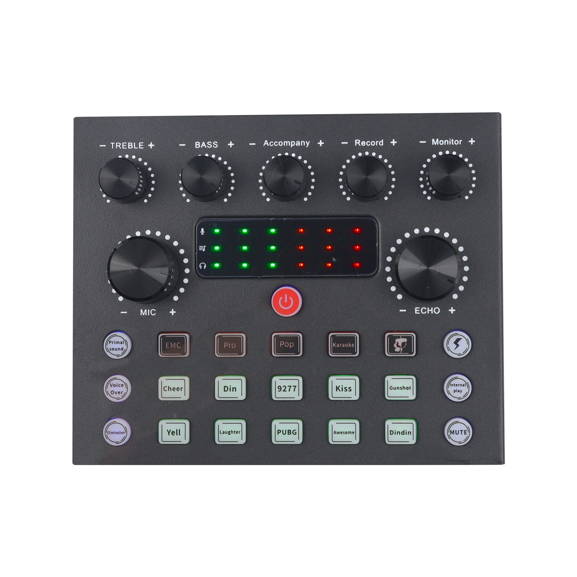 - Funciones: Ajuste de alta y baja frecuencia, monitoreo, acompañamiento, reverberación, grabación y ajuste de volumen de micrófono.