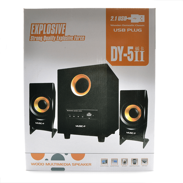 2 parlantes, 1 bajo, entrada USB 5v, salida 3.5mm, puerto USB, lector de memorias SD, 3 canales de 2.1, de 16w.